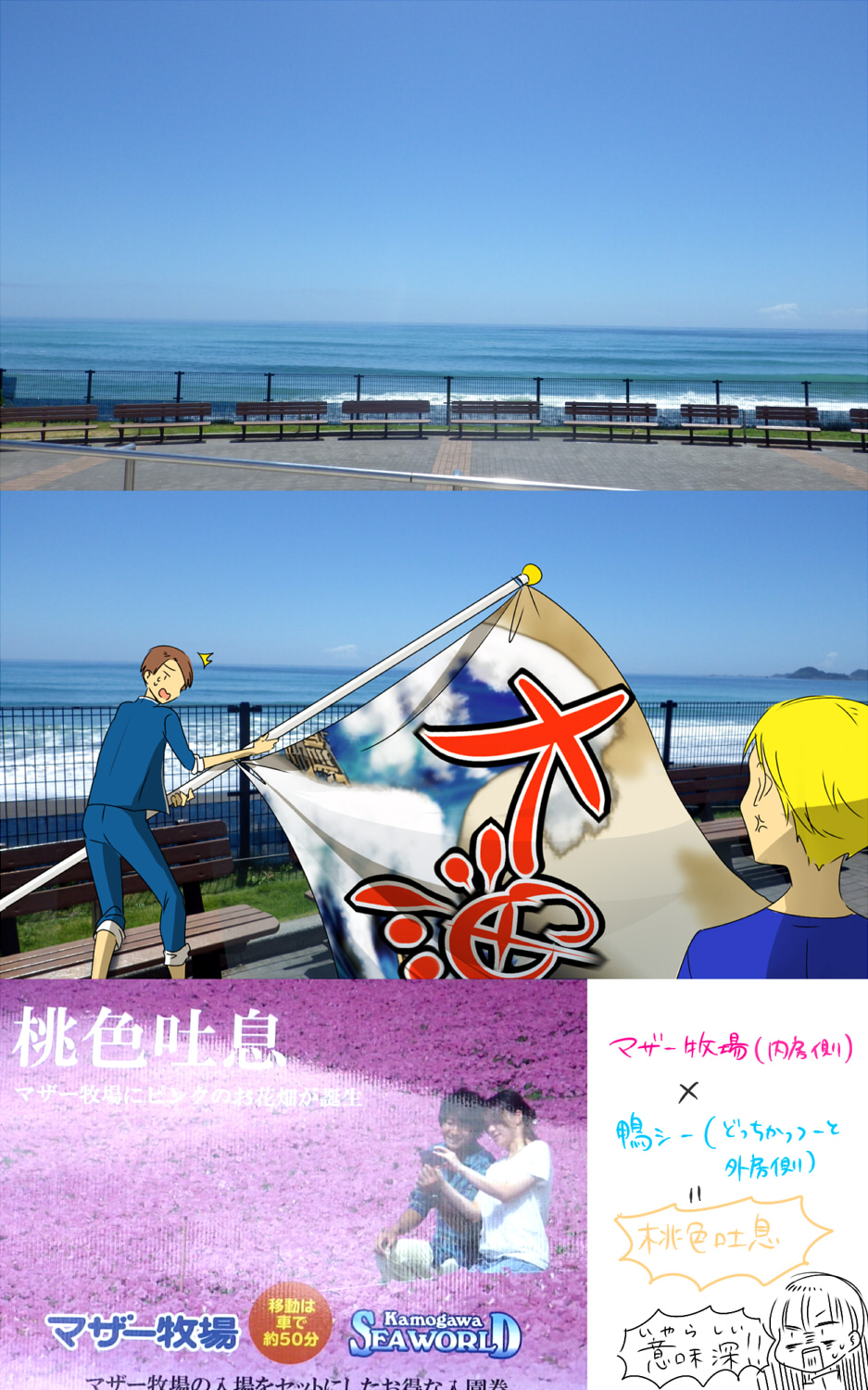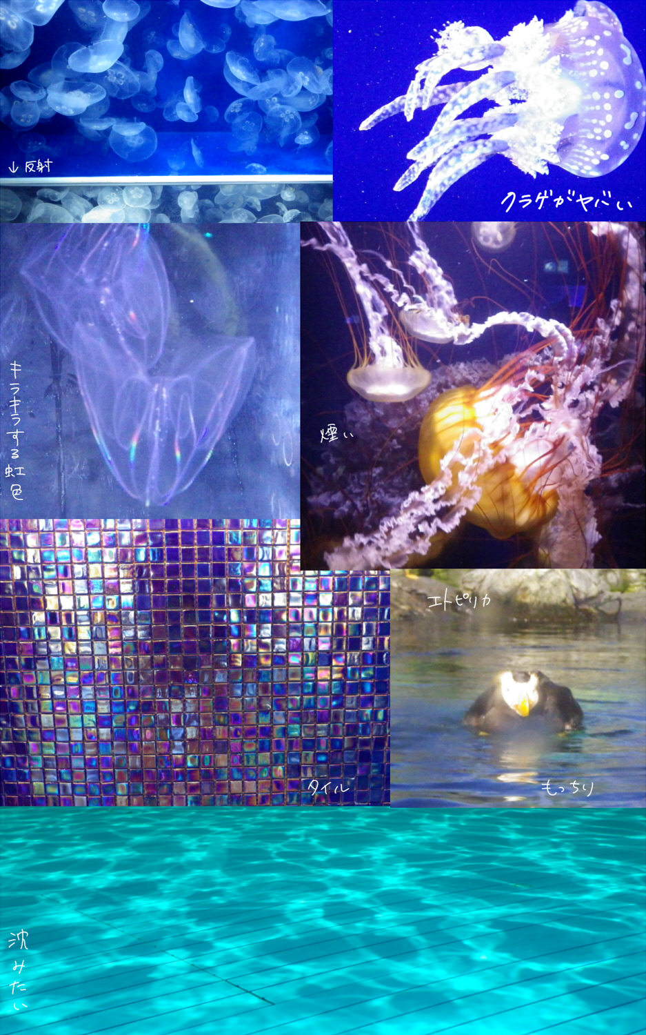 さがわさんでの朝ごはんは最高にうまかったのに、 自分でも信じられないくらい食欲が無くて、 一品ずつちょっとだけ手をつけてあとはみなさんに食べてもらった 今目の前にあの飯があったらかっこんで食べるのに・・・と悔しい気持ちである さがわさんでバス待ってる間に虫に殺されそうになりつつ 千葉の田舎の夏の空気を堪能して元気を出す バスは外の暑さをガン無視した涼しさで超快適 到着した鴨シーが恐ろしい程絵に描いたような青空を背景に佇んでおられた 入場券買うところのすぐ脇に、なにやら意味深なポスターがあって大歓喜 鴨シーはゲート入ってすぐに広場があって、その右に建物が伸びてるつくりっぽい 太平洋と空の青を見て、自然の色にはかなわねーなーとしみじみした なんか外房の潮噴きだのなんだのっていう下ネタに大はしゃぎしたり 例のマンボウみつけて総武さん総武さんと大騒ぎしたり みふさんがスタンプ回収に走り回るのを眺めたり クラゲコーナーが充実していて安らかな気持ちになったり なんとかっていう白いイルカみたいののショーの途中で医務室に駆け込んだり お昼の時のみふさんとユキニョさんの女子力とナス美さんのおっさん力が強かったり お土産買った後に海の近いテーブルでのんびりお茶会(仮)したり 割と万遍なく、外も中も見て回れたんじゃないかと思う 楽しかったー!! 今まで2回来たけど2回ともお天気だったので超ラッキーだと思う 多分2回とも一緒だったユキニョさんが晴れ女である可能性が高い そんなわけでもうちっとだけ続くんじゃ タグ:青鉄 旅日記 |