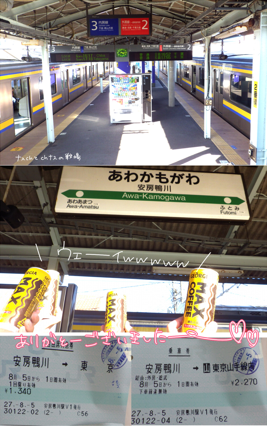 激熱の鴨シーを去り、聖地安房鴨川駅に来てしまう ジャスコ じゃなくてイオン鴨川でマッ缶×4を購入し 駅のホームで撮影会したり、ナス美さんとの戦いを思い出したり マッ缶を掲げて千葉ズに乾杯してるところを不審な目で見られたりしました 房総の特急様に世話になり東京へGO 車内ではじゃがりこ食ったり夕焼けを楽しんだりうとうとしたりして 東京についてからはあんまり覚えてないけど居酒屋に行きまして、 旅の思い出を語らいつつ、またchがUNOを取り出してしまい、 みふさんとchが良い感じに死亡しながらわいわいプレイしました(負けまくった) もう何食べたかもほとんど覚えていません 焼き鳥はあったかもしれない 毎度毎度申し訳ないことに田舎の民chのわがままで退場させていただき、 ゆらゆらしてるみふさんと一緒に新幹線の切符を買い、 新幹線に乗るまでの記憶も全く無いです そんなわけで真夏の千葉旅行で一緒に楽しんでくださった3名には超感謝! 体調悪いと何度もぐずって本当にマジで土下座するレベルで申し訳ありませんでした この旅以来電車がさらに怖くなったchでした!リベンジしないとね! タグ:旅日記 青鉄 |