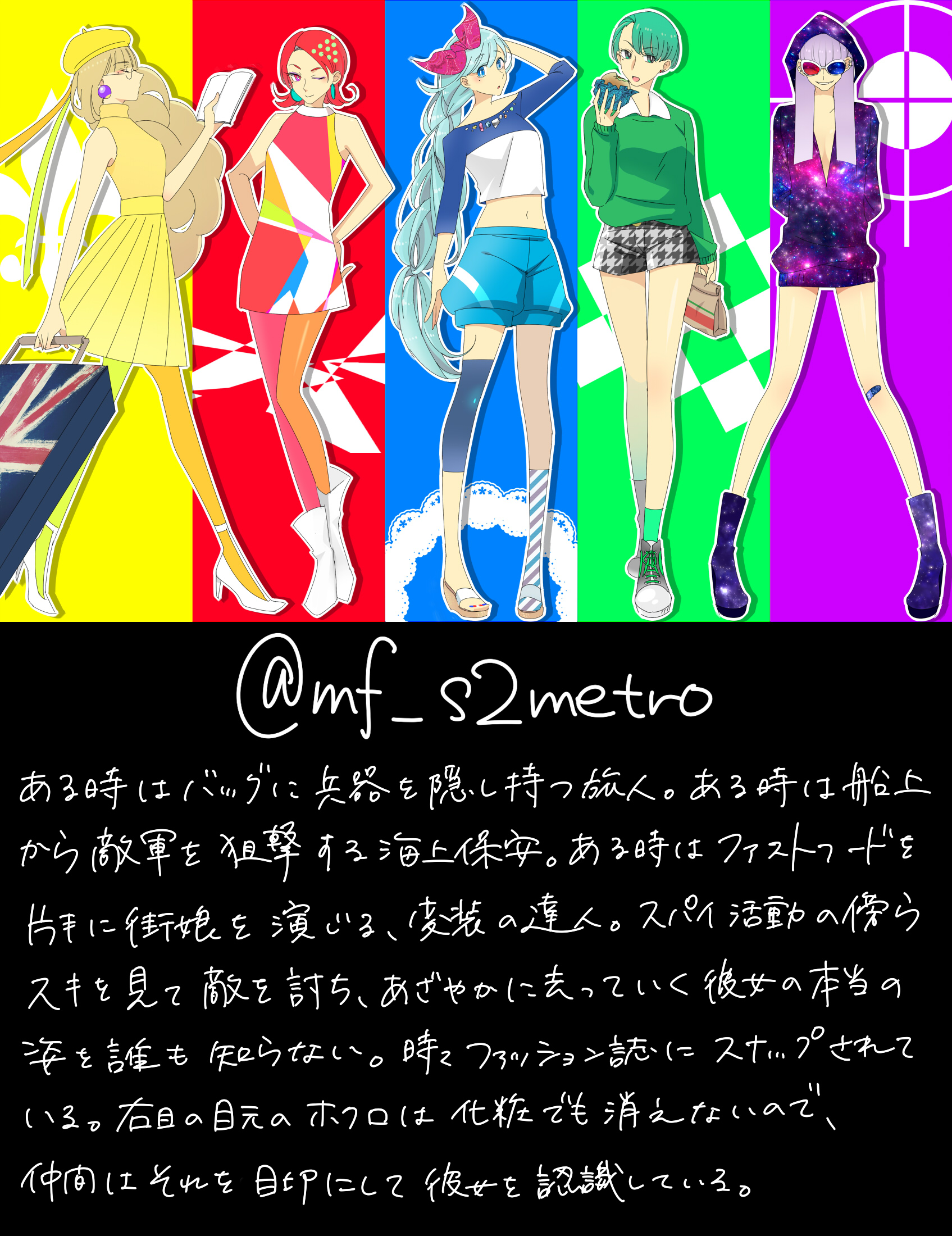 ふぉろあさん戦士化9人目は鼻血さんことぴろりさんことみふさん!! 明日お会いするんだけどなんて呼ぼうか未だに迷っておるみふさん! イメージ的には、コスとかフットワーク軽いところとかお洒落なところとか なので色んな顔・姿を持ってて敵を撹乱させる系に!ってのは速攻思いついたのだけど、 多面鏡に映る姿が全部違うってラフはボツになったり ポスター風にしたのは下着姿が際ど過ぎて表に出せず なんやかんやして攻殻立ちみたいになりました 恐ろしいほど私ファッションセンス無いからこの手の絵は描くもんじゃねえと思いつつ 60年代70年代のファッションはホント飛びぬけて可愛いから 描いててわくわくした 色どうしよ~とか ポップカラーなのよね 左から右へ徐々に現代風に近づく感じになんとなくなってますです あと青みふさんをマリンルックにしたのは灯台のイメージです でも一番chの中のみふさんに近いのは緑ちゃん この緑ちゃんをもうちょっと若くして元気にした感じ 明日会えるの楽しみだな~~~~あんまりドイヒーな話してドン引きされないように心得る あと全然関係ないけど、最近までやってた月9ののぶこんの浅井さんに突然惚れた お市ちゃんとの指輪シーン死ぬほど見た 幸せの極みのやつ~~~↑ 最終回で無理矢理助け出してほしかった みんなで仲良く暮らしてほしかった ウエ~~~~~~~~~~~~ン;;;;;;;;;;;; 明日寝坊して遅刻しないように寝たい しかしわがいもうとを迎えに行かねばな |