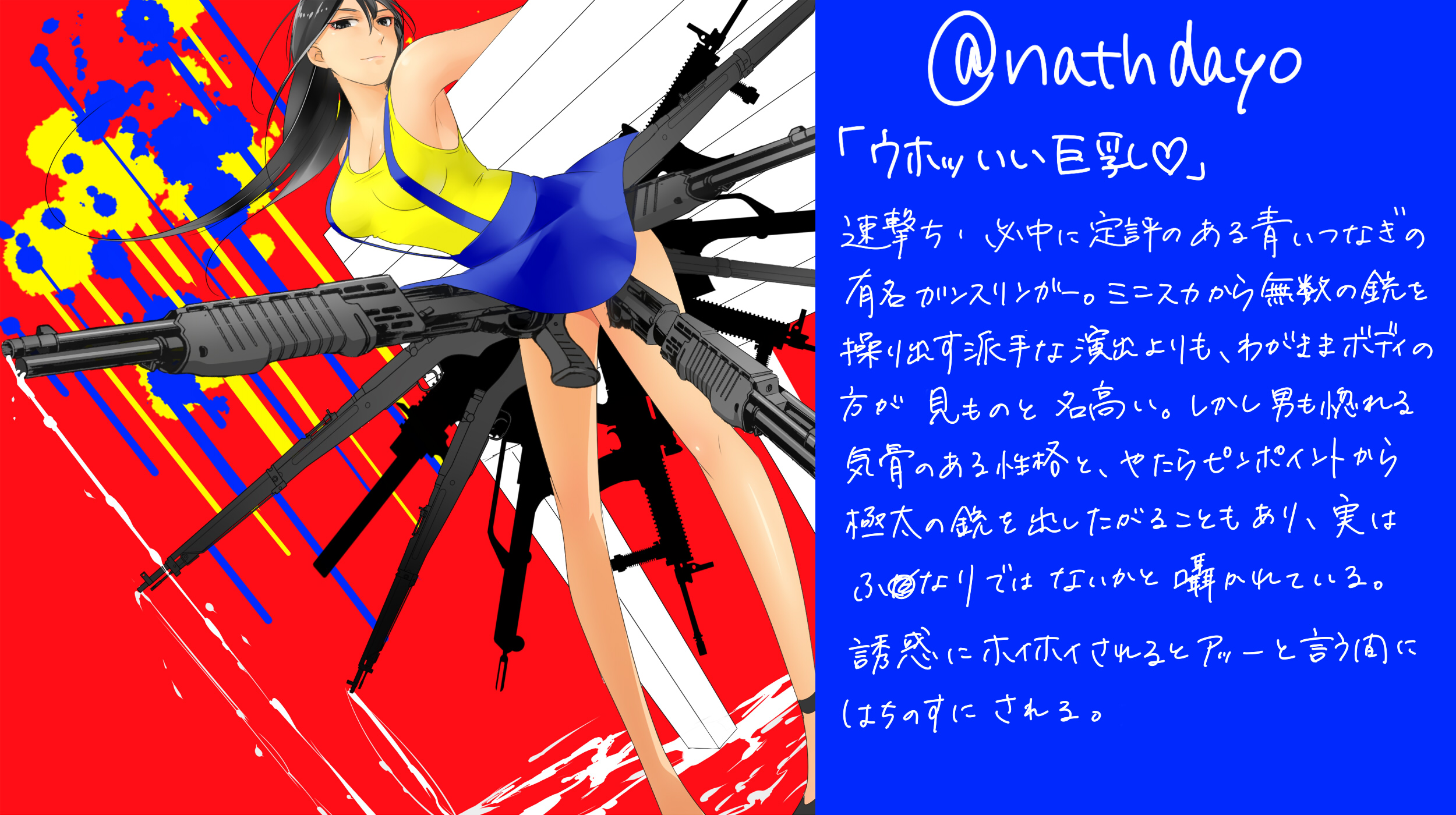 ふぉろあさん戦士?3人目は、黄色い彼の女性版と名高い(仮)ナス美さん!! イメージといえば男らしい性格なのにわがままボディなところ!!あと下ネタ そして忘れてはいけないのが、ご兄弟さまと一緒にあべさんやって雑誌に載ったやつ そんなイメージが混ざり混ざってごらんのとおりになりました ちなみになりましたって打とうとして成田って打った 末期 飾りすぎないのに派手な印象もあるかな 多分初めて会ったとき真っ黄っ黄だったからだな 青いつなぎと背景の何気ないベンチであべさんを表現しました ちなみに説明の「速撃ち必中」ってのは、ナス美さんとの会話からいただきました~~ 百発百中、絶対逃さない♂トイレに連れてかれて尻に穴開けられる あとこの絵ナス美さんに献上したら、銃口を掃除させるナス美さん×モブ本出すって言ってたよ(言ってない 色々想像してみたけど、ある意味男だったら、自分の尿道をごしごしさせて 「いいぜぇ❤もっと綺麗にしてくれよ❤最近銃口詰まっちゃってよ~」って モブ整備員にお掃除させるって感じだよね すまんけどちょっと神(我の子)出てきた むしろ整備員×ナス美さん がいいかな 成人男性向けで薄い本はよ |