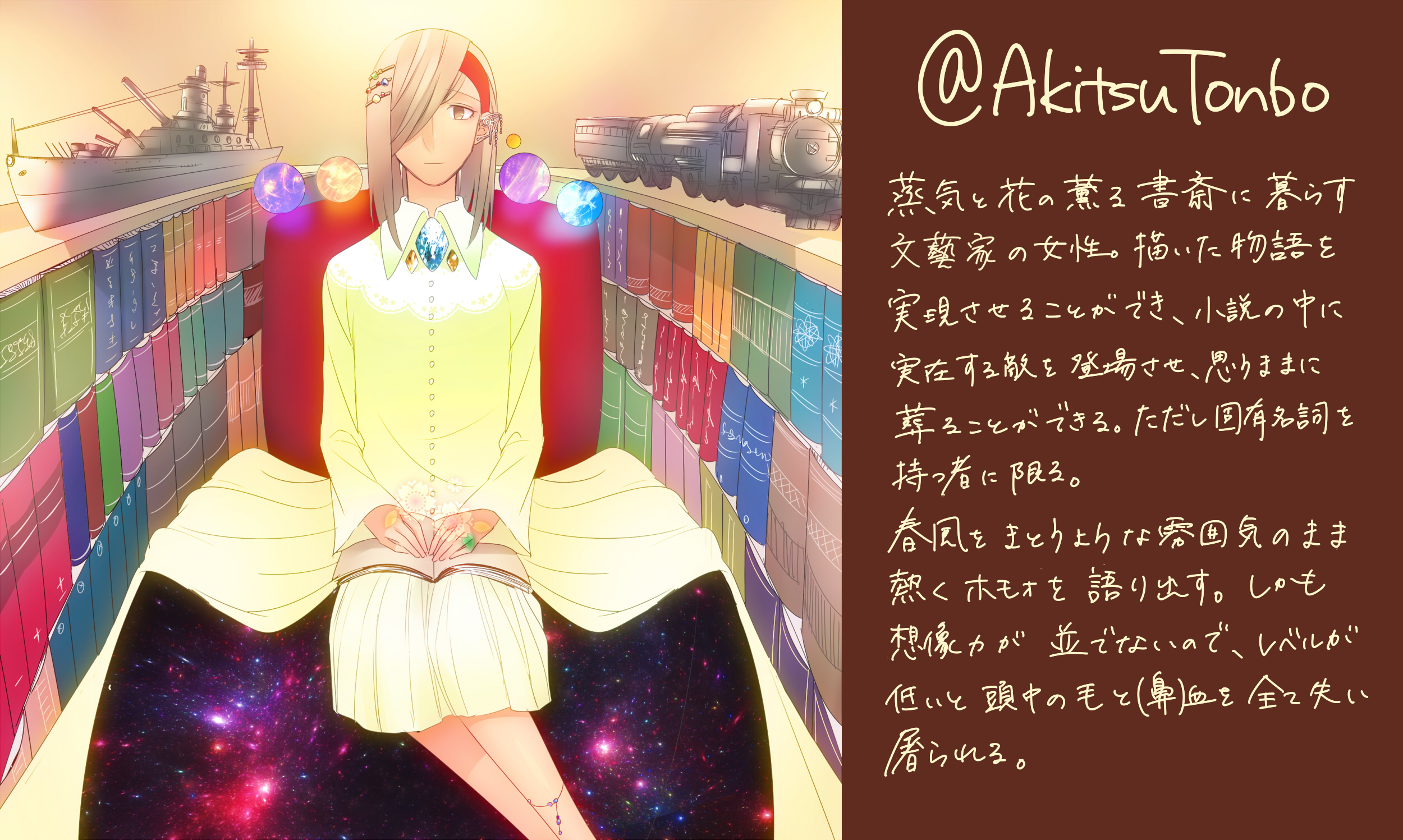 ふぉろあさん戦士化4人目は秋津さん!最近お知り合いになったばかりでござんす と言ってもchは一方的に存じ上げて非常にお世話になってた 秋津さんの文章って不思議で、ch生まれてこのかた聞いたことないような (特に和装に関する)正式名称とかたくさん出てくるのに なんでかわからんけど情景が浮かび上がってくる 嗅いだことないけどこういう香りなんだろうな、想像できないけどこういう色の中にいるんだろうな、って思えてくる そんな人が外内とか語ってくださるから屠られるch 御神酒徳利のやつらの話読んでて「マジでこんなんやってくれないか外内」と思ったのと 茶色とか渋い緑色で覆われた古書をたくさんもっていそう、 そして博識で落ち着いた雰囲気なイメージがあったので 物語を実現させる物書きさんにしてみました しかし物語に名前出せば好きにできるっての思いついたとき デスノ*トや・・・ってちょっと思った あとおふねとSL描いてみたけどしゅんごい難しかったのでこのざまです もうすこし彩度落としてシックな空間を演出()しようとしたけどこのざまです ちなみに本棚に某有名イギリスの小説も並べてみました 秋津さんが読んだことあるかは存じてない |