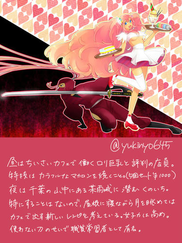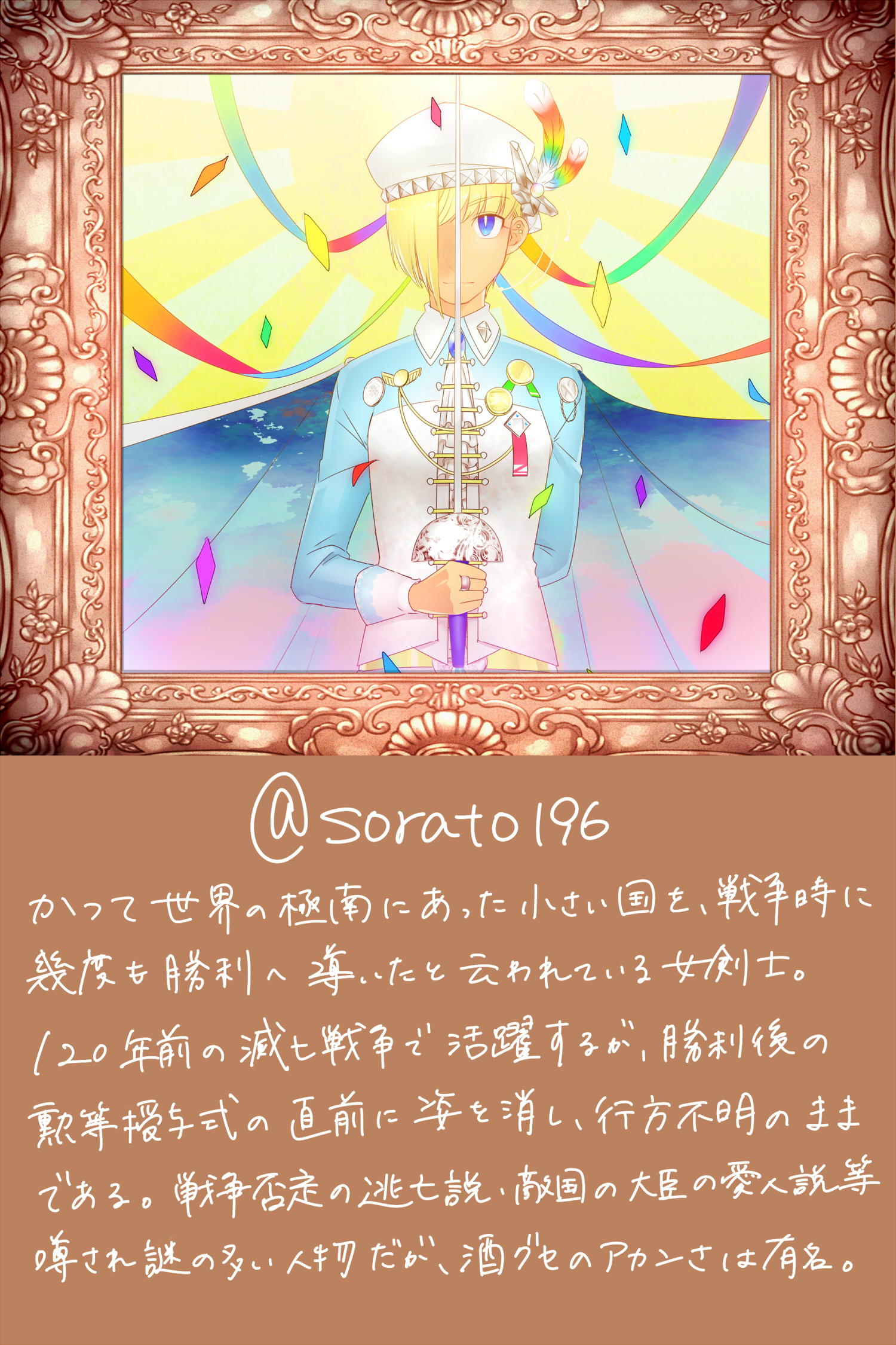 ふぉろあさん戦士6人目は青鉄で知り合いましたソラトさんーーーーーーー❤ 現在海外留学中ということで異国情緒溢れる(仮)感じにしてみました 変にサイボーグにしたりーっていうより全うな戦士!ってイメージでして でもぶっとい剣よりは細いやつで確実に突きに行く感じかなと そして高貴な感じ chの中では「蝶のように舞い蜂のように刺す」って感じで 周りの男戦士共も彼女に本気で挑まないとこてんぱんにされる そのしたたかさもあって、地域とか国からも名誉ある賞とか勲等を与えられてる でも正直、可愛い恰好して街に出て、普通の女の子らしく買い物したりってのにあこがれてる 戦士だからってのもあって女性扱いはほとんどされない そんなところにちょっと葛藤してる 剣で隠れちゃったけど。胸元の青い宝石は、彼女の功績を褒め称えた国王が 感謝と今後の期待を込めてプレゼントした、瞳の色と同じ宝石だったり そんな彼女は戦後に突然姿をくらまし、国中で必死に捜索したけど結局見つからず 時の人の失踪にしばらくの間新聞だの雑誌だので行方について取り沙汰されていたとか ソラトさんに献上したところ、なんと後日談を考えてくださったので 感激の涙を流しながら日々妄想しています、戦士ソラトさんは海を渡って 東の国で一人の坊主と禁断の恋に落ちたらしいです!!!ウオオオオ興奮する しかもその坊主=chというとんでもなく胸が熱くなる展開 これは坊主ch×ソラトさんの薄い本可能性あるで こんな感じの薄い本はよ はよ!!!!!! 最近仕事中に「東の国の小さいお寺にある日、金髪の異国の女性がやってきて 文化も違う言葉も通じない場所で戸惑う彼女と、彼女を支えたいと思って 接してくる一人の坊主のふわっとした感じの馴初め話」を妄想してました 申し訳ありません 超楽しい |