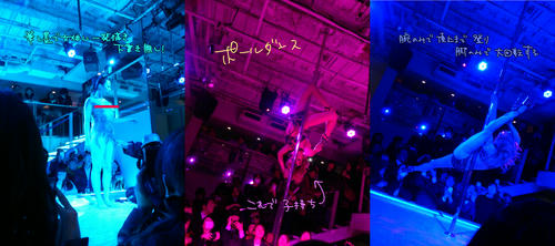 昨日はナス美さんと表参道デート エロチカジャポネスクさんの公演に行きました! 結果から言うとリーマン緊縛は 今回は無かった・・・! しかしパティシエ緊縛はあったぞ!! ナス美さんはイラスト(再現率マジで高すぎて鼻水出た)付で 日記公開中!ナス美さんの日記へGO! 以下chのスマホの粗い画像でお送り なんか女性のお体におっさんが筆滑らせてて あれ描き終わったら踊るのかなーと思ってたら 1時間近くずーーーーーっと描きっぱなしで 終わった!と思ったら別に踊ったりせずそのまま退場して一人でずっこけた 鳳凰?不死鳥?わからんけど鳥だった すげえ迫力だった! モデルの方全裸でずっといて寒くなかったのかなって思った 次のポールダンスのお姉さん美人だなーと思ったら経産婦で超びびった ナイスプロポーションどころか腹筋われてる 腕力だけでどこまでも登るし片脚だけポールに巻き付けてぐるんぐるんするし 体幹どんだけつええんだよ!!って感動した ちなみに脱ぎませんでした フラフープのお姉さんも強かった 産後数か月しか経ってないとかで しかし安定の演技を見せてくれました 眩く光るブラ着けてきたときは噴いたけど 七色のフラフープを自在に操り暗闇でネオンのようにきらきらするので 目を奪われクリスマスがもう一回来た感じになった ちなみに写真が上手く撮れなかったんだけどこの後別の方の鞭の演技で 街灯のイルミネーションみたいなきらきらがついてて綺麗だったけど、 鞭のあまりの速さに周りの空気が揺れてるのがわかって怖かった なんか速すぎてビールの瓶がシュパっとなっちゃうらしくて 演技中前の方のお客さん座らせてました それでも怖かったぜ! この和太鼓(正直演奏だけかなーとそんなにwktkしてなかった)が 会場大盛り上がりでヤバかった 演奏も素晴らしかったけどさすがエロチカ、パフォーマンスが性的 シャツの段階でええ身体してるなーと思ってたら前から破って半裸になり 湧き上がる黄色い声、そして和太鼓の一般参加で半裸の変態達3人に 手取り足取り教えられてたキャンディちゃんたちのテンションの上がり方ヤバかった 最後はなんか難しすぎて(あと酔ってて)あんま覚えてないけど 写真右のパティシエの男性と最初の鳥描かれた女性が一緒に 縛られているのをハラハラしながら見ていました ハラハラしながら縄師総武さんと縛られる成田を想像したことを白状します またも写真ないけどどっかでジャグリングもやりました トマトみたいな赤いボールを5つも持った兄ちゃんが 進化したお手玉を見せてくれました あれ忘年会とかでやったら尊敬される あと謎のハットの兄さんとカオナシの和服女性の舞と、 そのあとの蛇の目傘と扇子持ったこれまたかおなしの女性たち& 豹柄の全身タイツの変態の太鼓演奏も写真撮れなかった・・・! この辺から酔っぱらいつつずっと立ってて腰本当に骨折するかと思った あと貧血! ちょいちょいナス美さんをチラ見して女体に夢中になって食い入るように見てたり 男体にテンションあがってたりしてた! chもテンションのあまり彼女の上腕を何度が殴りました すまなかった… そんな感じで今年の最後までナス美さんと遊んでました ラブレターも渡したし、来年もすぐ飲み会あるし、生きていける しばらく遊びに行く予定とエロ千葉じゃぽねすくの妄想を支えに生きていこうと思います。 関係ないけど遊んだあといつもは帰宅してたけど 帰るのめんどくさくて都内で一泊し今日地元戻って真っ直ぐ出勤するっていう 田舎の民にしては背伸びしたことをしでかしました おかげで今めっちゃ眠いです 大掃除の後生理痛で死にました☆ 筋肉痛もやってきたし今日はゆっくり眠りたい ホテル泊まりも大好きだけどね タグ:イベント |