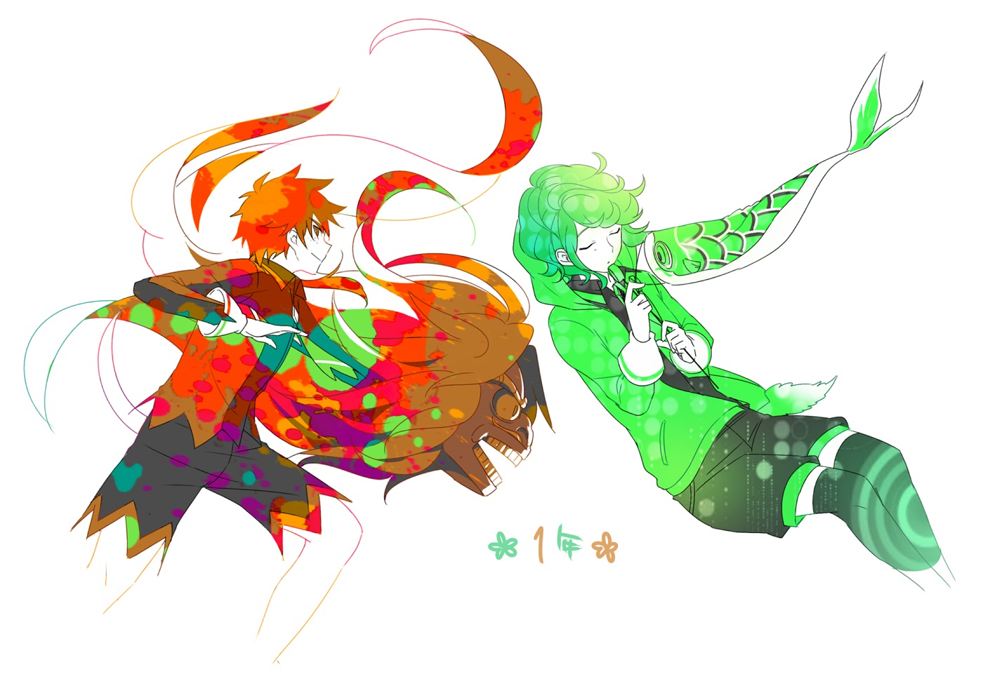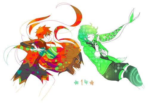 さきっちゃんとみろっくん~~~~1年コンビが熱い! めもたん さきっちゃんの、シャキっ!てした感じはなかなかむずかしい! そしてそのさきっちゃんより存在感のある獅子神様 出張りすぎた!逆光にすりゃよかったな~ みんなの隊服の色のついてるところと髪の毛は、もともと同じ色をスポイトしてたんだけど、 さきっちゃんの髪と獅子神さんの髪?が同化してしまった事件がおこり 8人全員イメージカラーと髪の色を若干違う色に変更した しかしこうきくんなんて全然わかんない…ね・・・別にいいんだけど 黄色ってむずかしい みろっくんは、なにがなんでも風を吹かせたかったので色々考えた結果 武器(こいのぼりちゃん)がヘタってるのもな…と思い追い風になった いつも味方に有利な風を運んでくれるみろっくんマジアロマ しかしみろっくんのあのふあふあヘアー、ただでさえ描くの苦手としているというのに、 風を吹かせる条件をつけるとかやはりMであるのか私は ただややこしくしてるだけか! 1年コンビはなんやかんやで描けたな、という印象でまんぞくまんぞく! とても楽しかったです!!シュトケン全員嫁に来い |